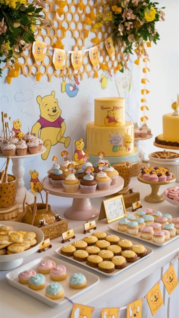 The dessert table often becomes the heart of a Winnie the Pooh baby shower, not just for its treats but for the way it visually tells the story of the day.